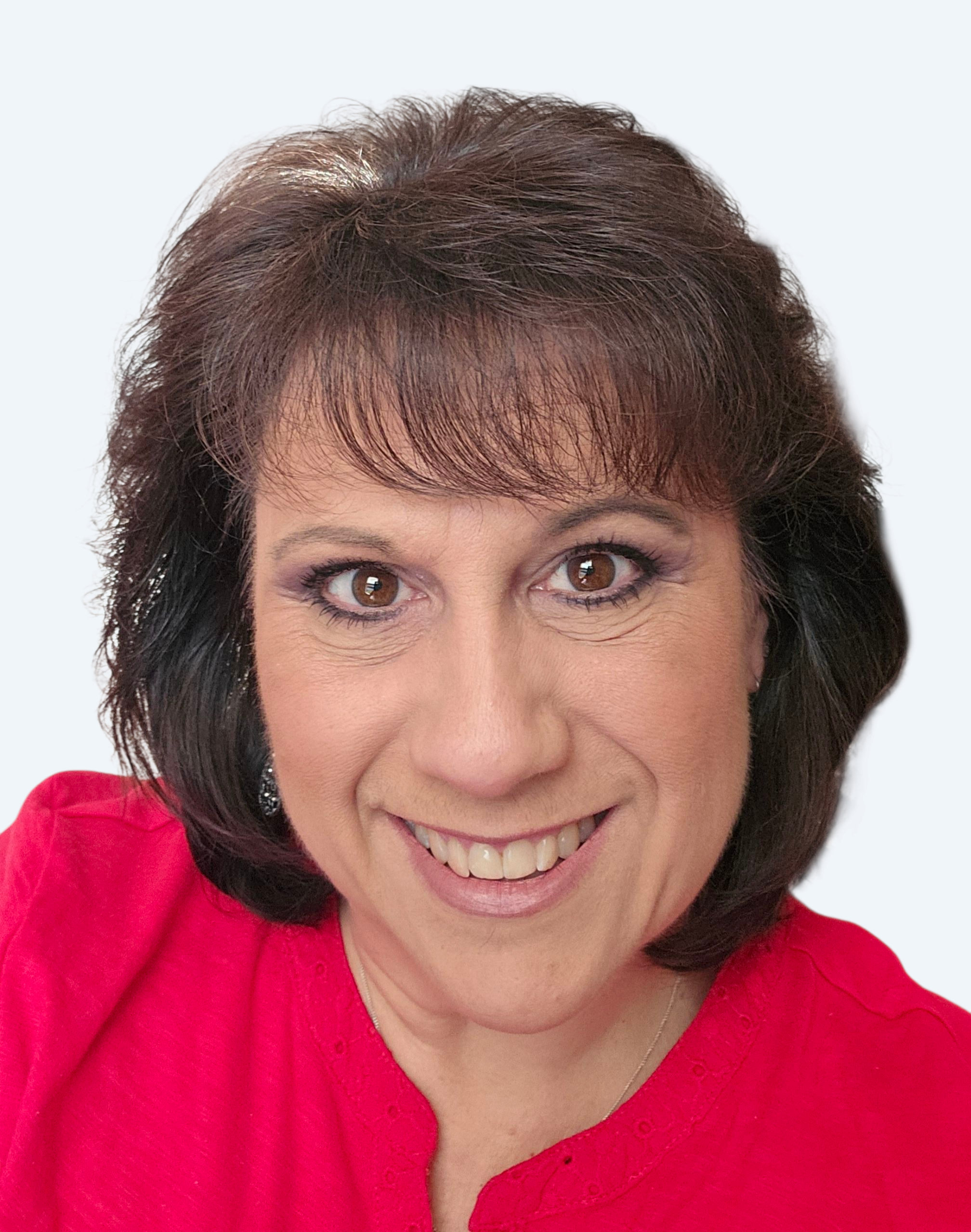 Close-up of a woman with shoulder-length dark hair, brown eyes, and a bright smile, wearing a red top, against a light background.